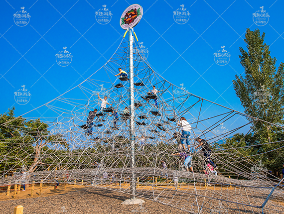 勇攀珠峰項目特征:勇攀珠峰是全方位攀爬設(shè)施,全部采用游樂繩編織而成。勇攀珠峰產(chǎn)品采用金字塔造型,可以從任何一邊攀爬至項目頂端,可多人同時攀爬,可以滿足團隊和親子家庭等多人群使用的經(jīng)典游樂項目