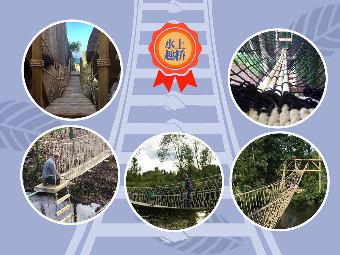 水上趣橋項(xiàng)目是在寧靜的河面上建起一座座有趣、橋體造型各異的小橋連接兩岸,使得此區(qū)域的游樂性能大增,其游樂焦點(diǎn)除了在色彩、造形上給人耳目一新的感覺外,水上趣橋的特點(diǎn)是游人參與性強(qiáng),過橋的難易程度很具挑戰(zhàn)性,有令人恐高的五環(huán)橋;也有集體力、平衡力于一體的吊樁橋;有嘗試體形靈活性的鉆圈橋;也有意義獨(dú)具的要雙人攜手才能過的情侶橋等等,對(duì)不同年齡、興趣、膽量的人都有極高吸引力,并且名稱的設(shè)計(jì)具有獨(dú)特的含義,水上趣橋是每一處有水面的場(chǎng)地必備橋類項(xiàng)目。